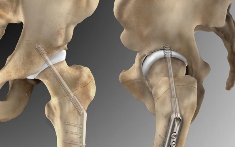 In this illustration we see the Omega3 Compression Hip Screw System used to repair a fractured femur. You are looking at both the anterior view (left) and the lateral view on the right. The injury illustration can be seen here.